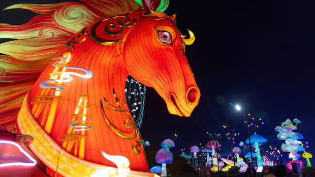 週五,神話生物和動物在中國西南部城市自貢點燃了一場燈會,慶祝即將到來的農曆馬年(2月17日)。