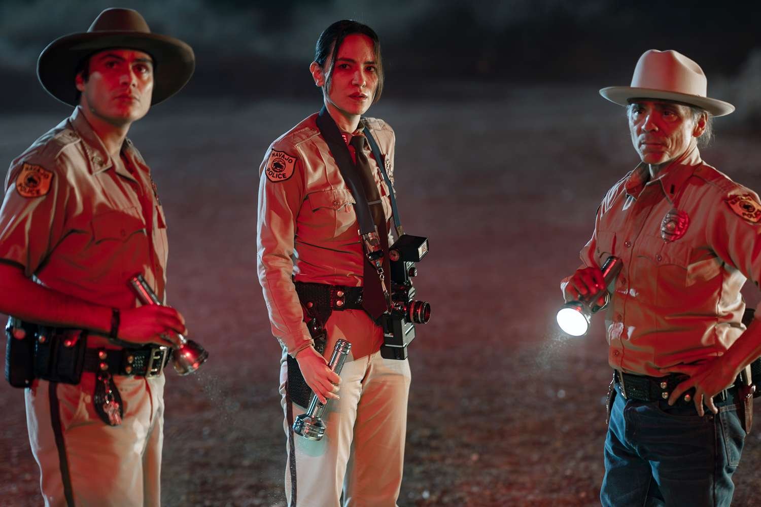 《黑暗之風》中,Chee(基奧瓦·戈登飾)、Manuelito(傑西卡·馬滕飾)和 Leaphorn(扎恩·麥克拉農飾)觀察死亡霍根的內部。