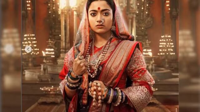 從精緻的 Nauvari 紗麗到複雜的傳統珠寶,Rashmika 的 Yesubai 視覺體現立即脫穎而出。她高貴的姿態和端莊的寧靜體現了馬拉塔女王的優雅和靈活性。