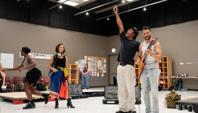 在排練室的一側,劇院作家南路Zayd Ayers Dohrn坐著一個開放的文字程序,他的手指在觀看演員時,他的手指靠在咖啡的邊緣。