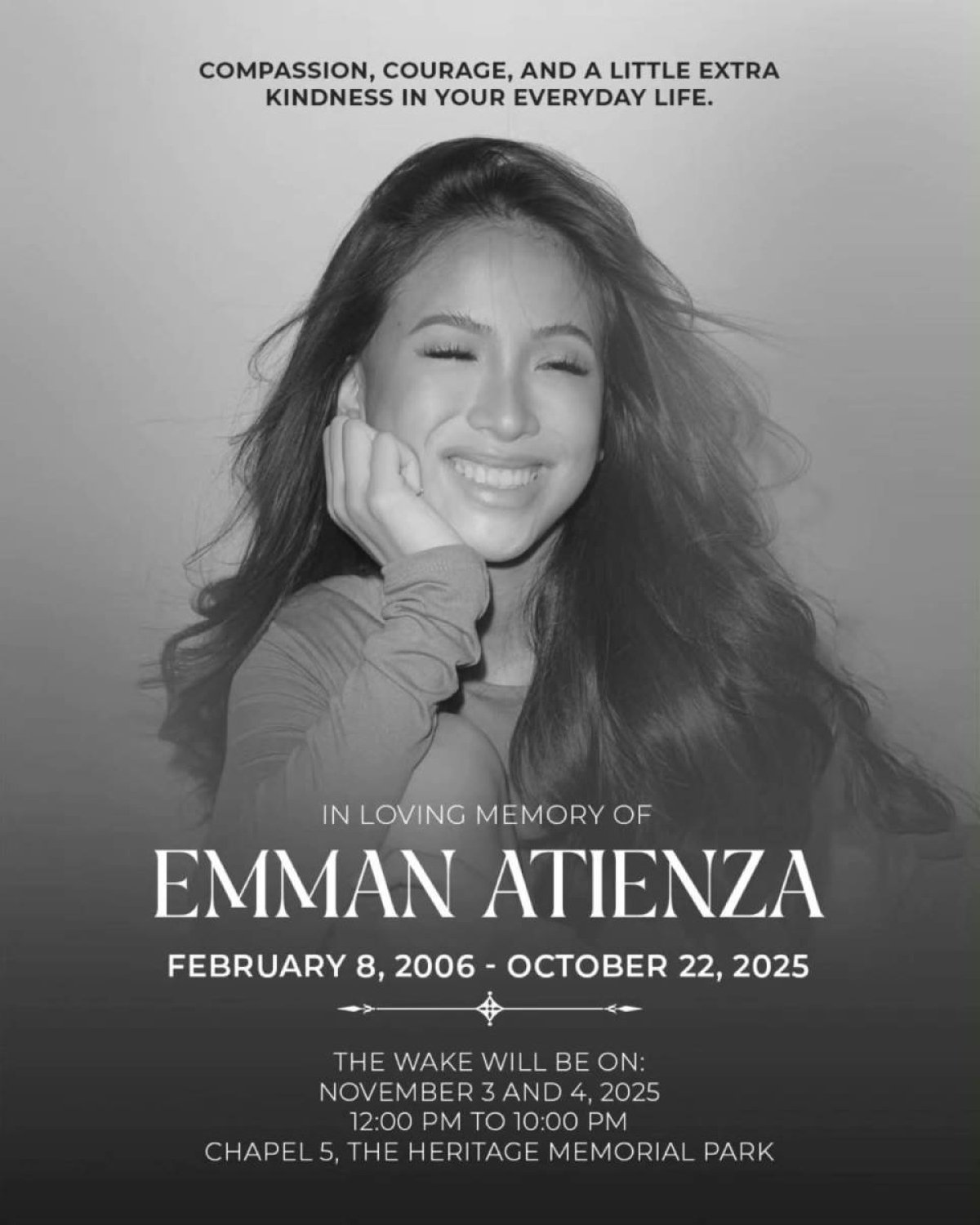 菲律賓馬尼拉— 週四,電視名人金·阿蒂恩扎 (Kim Atienza) 宣布了他女兒伊曼·阿蒂恩扎 (Iman Atienza) 葬禮的細節,伊曼·阿蒂恩扎 (Iman Atienza) 於 2025 年 10 月 22 日去世,享年 19 歲。