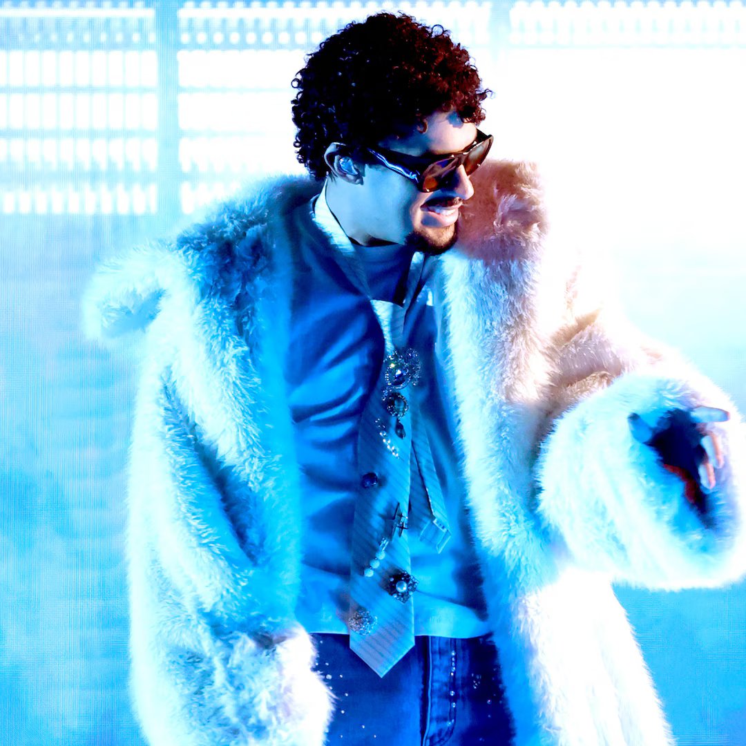 “這將是一場盛大的派對,”這位波多黎各藝術家在 2 月 5 日舉行的新聞發布會上承諾道,他穿著灰色條紋 Bottega Veneta 套裝、人造毛皮大衣和帶有蓬鬆兔耳的無簷小便帽。 “當然,我想把我的很多文化帶到舞台上。但是……我不想破壞任何東西。這會很有趣。”