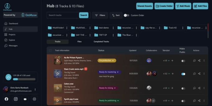 Ommuse 提供了一套全面的功能,旨在增強音樂家、唱片公司及其團隊的工作流程。核心功能包括用於音樂目錄、文件、合同和媒體的無限雲存儲——用戶可以在一個安全的位置管理其所有資產。 Ommuse 還包括版本控制,允許藝術家在重新審視和完善其創意作品時跟踪和管理其曲目的多次迭代。