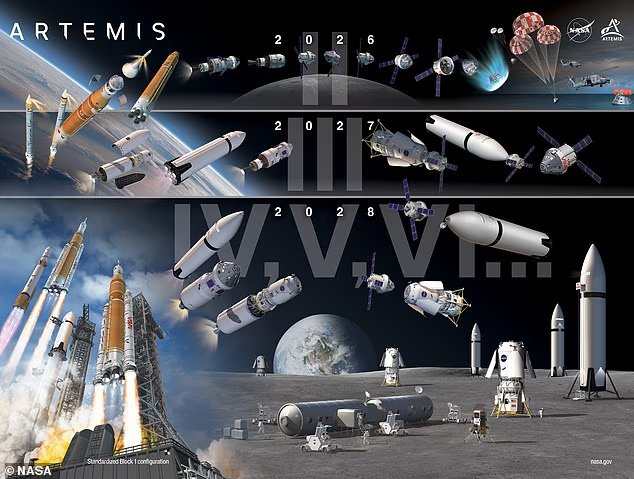 NASA 宣布對其探月任務時間表進行徹底修改,將登月推遲到 2028 年,此舉引發了網路上的憤怒。圖為:美國太空總署提出的阿耳忒彌斯任務時間表