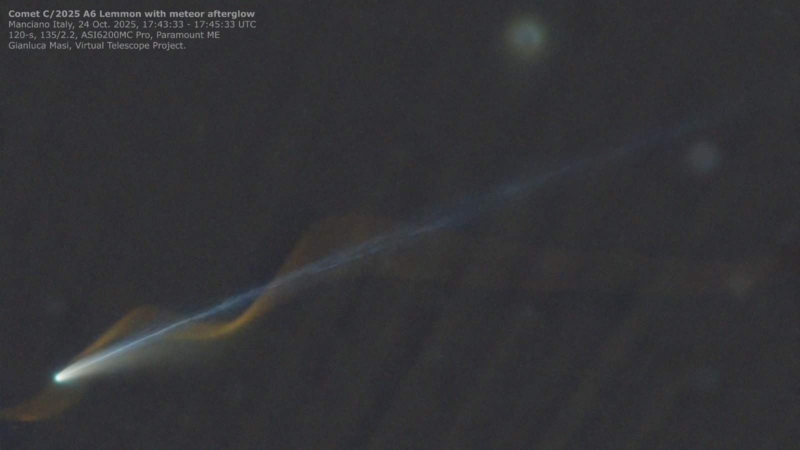 10 月 24 日,虛擬望遠鏡項目的天文學家吉安盧卡·馬西 (Gianluca Masi) 看到,一串明亮的流星軌跡似乎環繞著萊蒙彗星的尾巴。 (圖片來源:Gianluca Masi,虛擬望遠鏡項目)