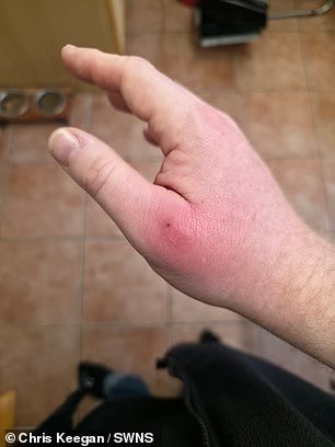 40 歲的克里斯·基岡 (Chris Keegan) 一天早上醒來,右手被小蟲子咬了一口,一開始並沒有在意(左)。但咬傷最終腫脹,使他的手「有保齡球那麼大」(右)。