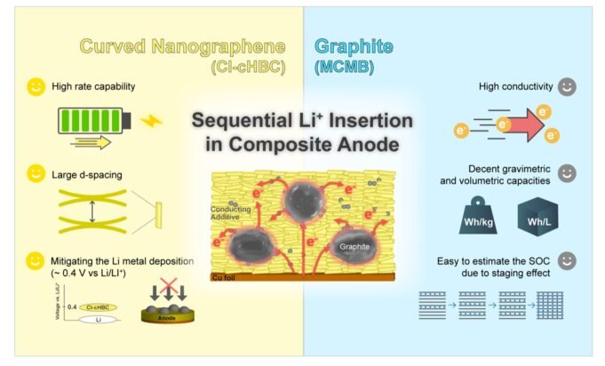 Cl-cHBC 和石墨 MCMB 在混合陽極中的協同效應示意圖。信用: 先進功能材料 (2025)。 DOI:10.1002/adfm.202514795