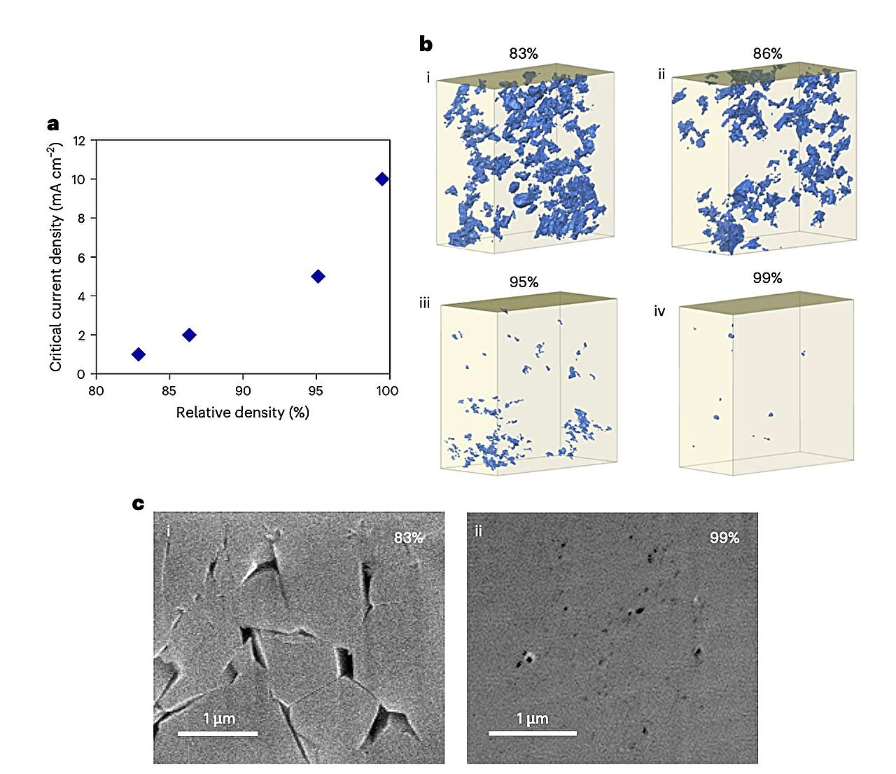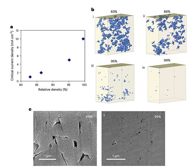 “我們表明電流是900萬厘米-2 可以在沒有樹突形成的情況下實現6狗5CL,最多99%,” Siniskalchi及其同事Melvin寫道。微觀結構的變化6狗5使用離子束的聚焦電子顯微鏡斷層掃描確定密封的CL從83%到99%確定,並用於計算其對臨界電流密度(CCD)的影響。透明