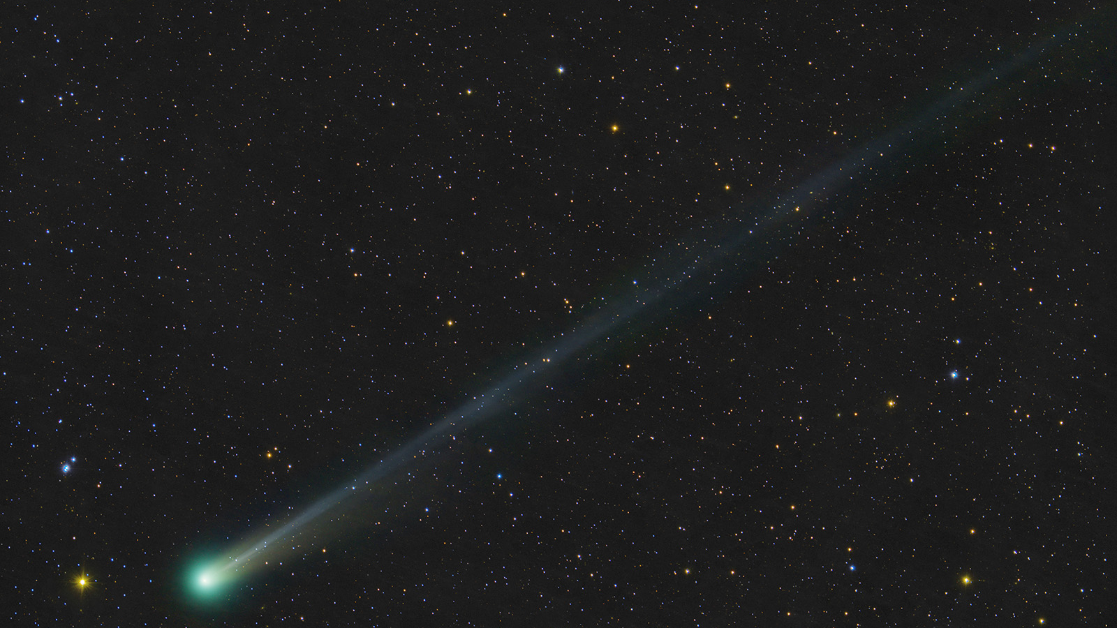 即使是最詳細的觀點,也是由天體攝影師丹·巴特利特(Dan Bartlett)的禮貌出現的,他在許多夜晚拍攝了彗星,以發現其有史以來的複雜結構如何隨著時間的流逝從他最近幾週的加利福尼亞六月湖的後院演變而來。巴特利特(Bartlett)抓住了彗星的愛奧尼亞尾巴的蠟,並褪色,而它被我們的父恆星散發出的太陽風綁在一起。