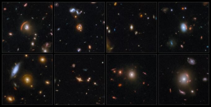 這幅拼貼畫中呈現的一些星系已經被 哈勃空間望遠鏡, 但詹姆斯·韋伯太空望遠鏡更詳細地展示了它們,揭示了引力透鏡的新數據。