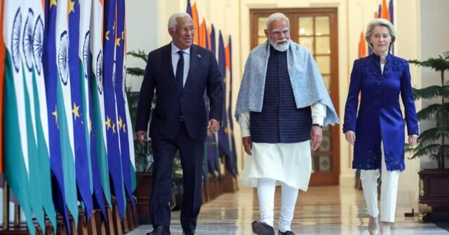圖片:2016 年 1 月 27 日,納倫德拉·莫迪總理與歐洲理事會主席安東尼奧·路易斯·桑托斯·達科斯塔和歐盟委員會主席烏蘇拉·馮德萊恩博士在新德里海得拉巴宮會面。 照片:DPR PMO/ANI 照片