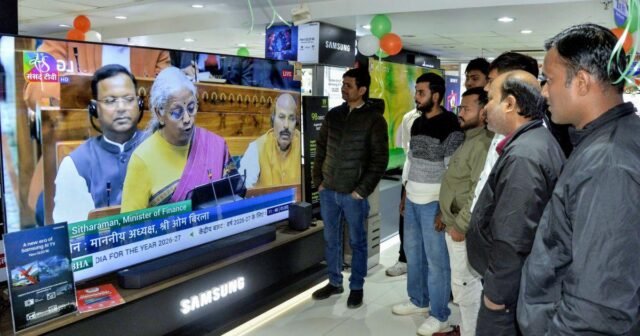 圖片:週日,人們在巴特那觀看財政部長 Nirmala Sitharaman 的經濟演講直播。 照片:ANI 照片