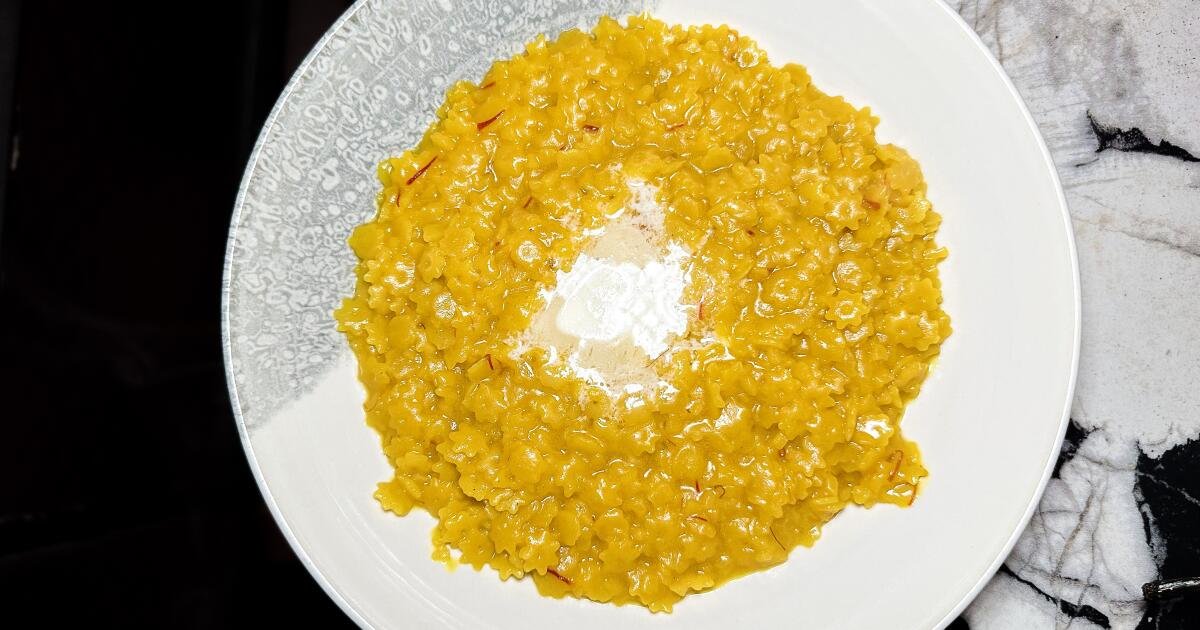 美味的小斑點帕斯蒂納在富含帕爾馬乾酪的布羅多中煮熟,用藏紅花磨碎,最後塗上厚厚的黃油。也許米蘭燴飯是靈感來源,但最終的結果卻嘗起來像是非常鹹、奢華的燕麥片。這很奇怪,但也很棒。