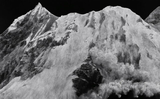 這張明信片成為她的梅尼爾展覽「盲目愚蠢」的一部分,該展覽現已在俄亥俄州哥倫布市的哥倫布藝術博物館展出。我花了三個小時看完整個展覽,不僅因為它內容廣泛,還因為她的作品非常不尋常,需要時間才能理解她在做什麼。獲得具有紀念意義的黑板設計 蒙塔豐的信。它橫跨博物館的整面牆,高 12 英尺,寬 24 英尺。這幅作品完全用白色粉筆繪製,描繪了奧地利阿爾卑斯山的一座大山。它根據一封信講述了 1689 年發生的導致 300 人死亡的雪崩。當牧師到達為死者服務時,另一場雪崩埋葬了他,然後第三次雪崩又把他露出來。迪恩覺得這個故事帶來了希望。裂縫、懸崖和飄落的雪花,黑色地面上的白色浪花,全都是用孩子簡單的粉筆描繪出來的。高聳的山峰直衝天空,呈向下掃掠的形狀,彷彿陷入了陰險的雪崩的漩渦中——這是一場雷鳴般的運動。這個「計畫」很脆弱,因為迪恩沒有使用穩定劑。在運輸和安裝過程中,粉筆可能會在某些地方被擦掉。他回來了,爬上梯子,騎著堆高機,去觸摸它。