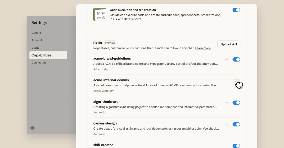 Anthropic 首席產品官 Brad Abrams 表示 邊緣 “我對技能感興趣的基本上是關於特工的。”他說,技能作為一項功能本質上為組織建設者提供了一種方法來教導克勞德“在這種情況下”做好工作。他強調,這不是為了滿足任意的基準,而是為了能夠在自己的公司完成你需要做的工作。