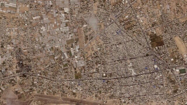 衛星圖像顯示 2023 年 8 月 20 日戰前的拉法。 (Planet Labs PBC,路透社)