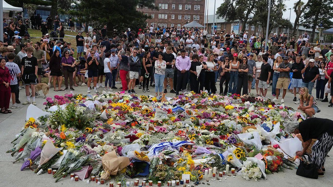 2025 年 12 月 15 日星期一,即槍擊事件發生的第二天,人們聚集在悉尼邦迪海灘邦迪館外哀悼槍擊事件的受害者。 (馬克·貝克/美聯社照片)