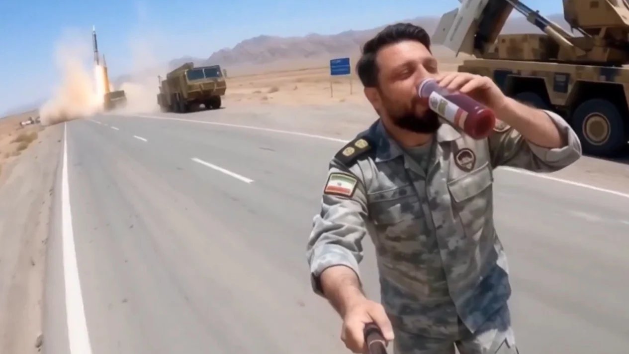 這段20-25秒的影片顯示,易卜拉欣身穿軍裝,一手拿著自拍桿,一邊喝著石榴汁,一邊玩滑板,看起來很放鬆。影片中的易卜拉欣正在玩滑板,背景是一枚彈道飛彈,濃煙滾滾衝上天空。