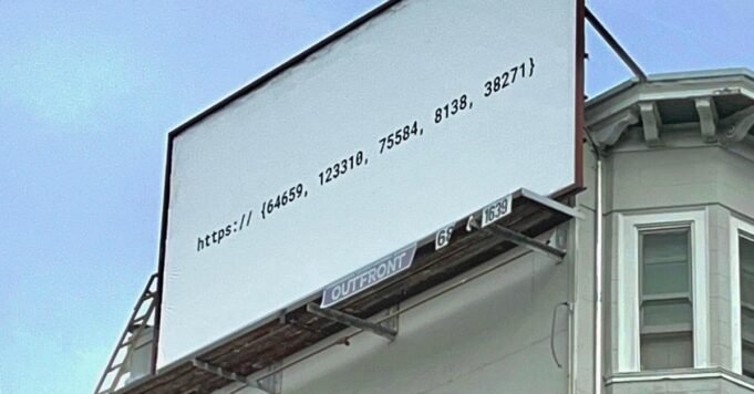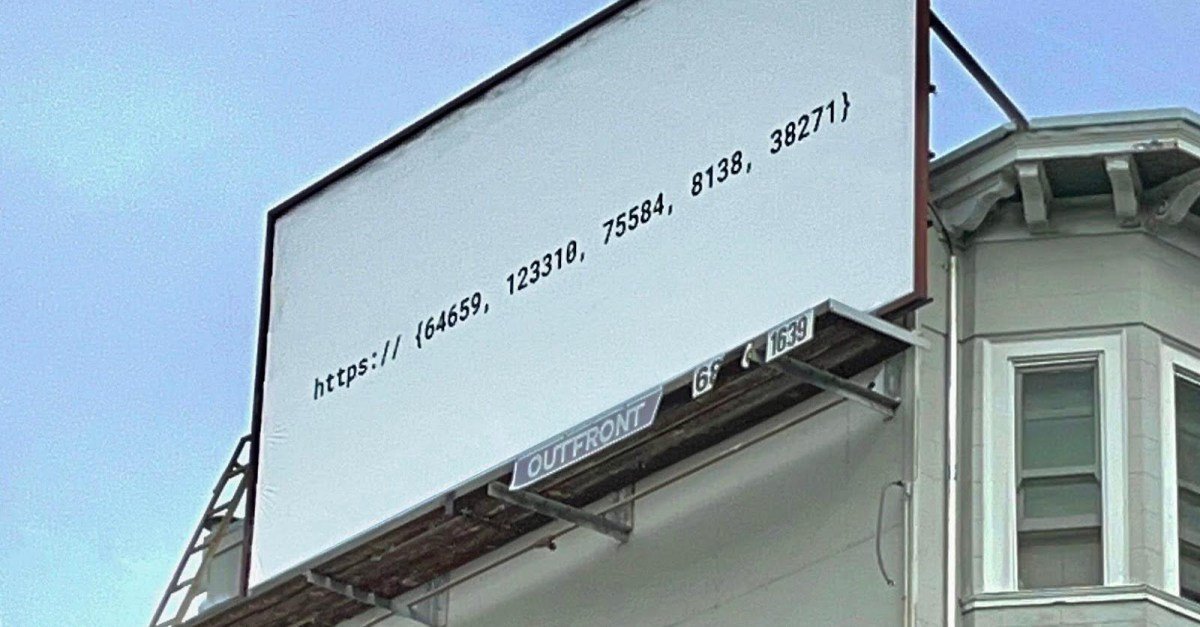 標誌沒有說“聽實驗室”。他什麼都沒說招聘。它由簡單的白色背景和“ https://”和一系列懸掛在舊金山的Nob Hill上的分組數字組成。