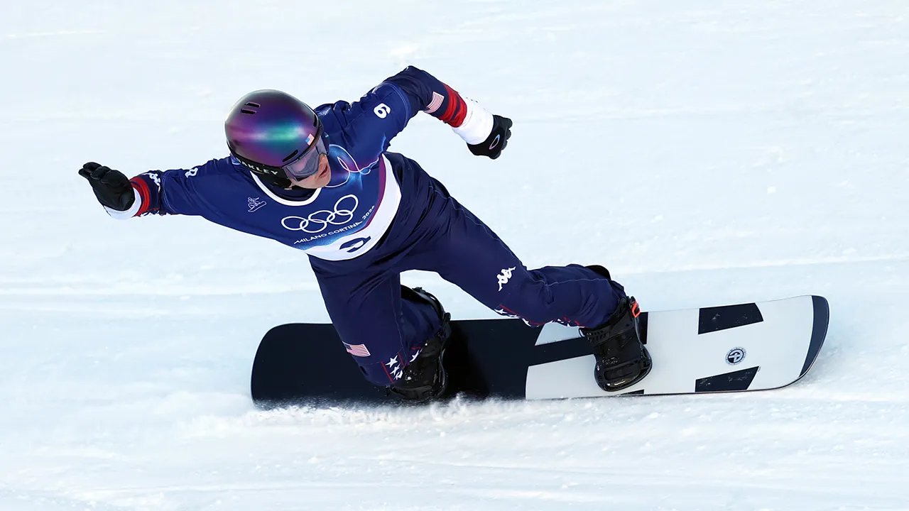 2026 年 2 月 12 日在義大利利維尼奧舉行的 2026 年米蘭科爾蒂納冬奧會上,美國選手內森·帕爾 (Nathan Pare) 在男子單板滑雪四分之一決賽中受到處罰並排名墊底後做出了反應。 (內森·雷·塞貝克/Image Image)