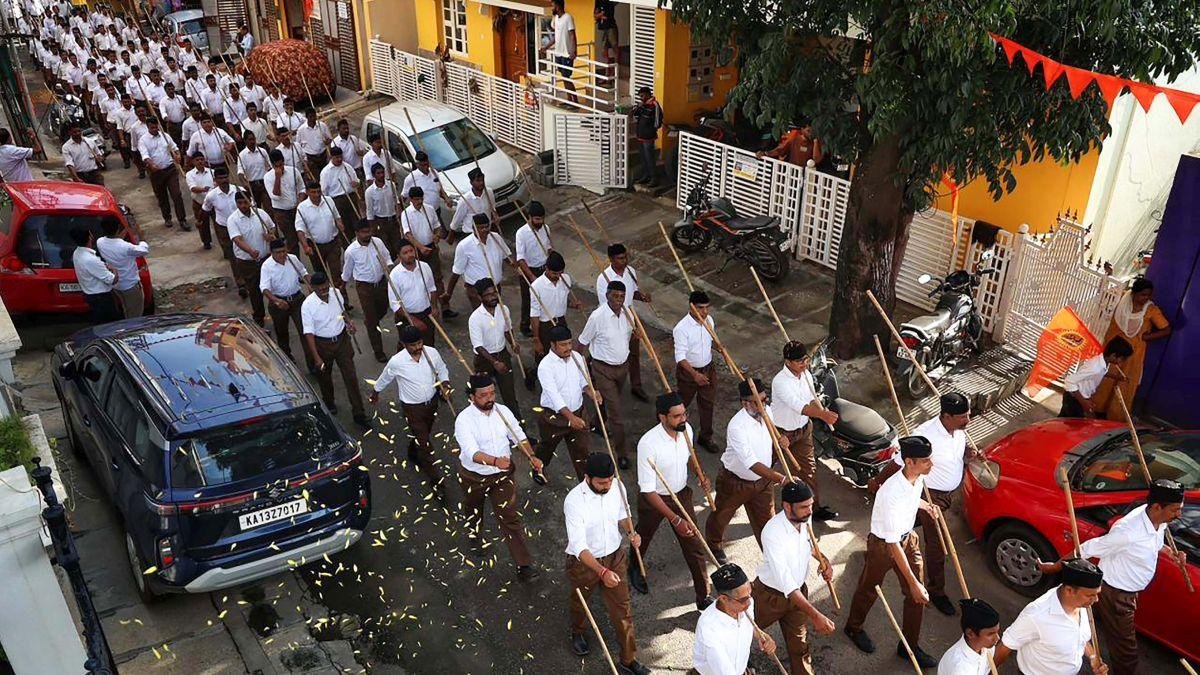圖片:Swayamsevaks 在班加羅爾參加 RSS 百年慶典期間的遊行。 照片:ANI 照片