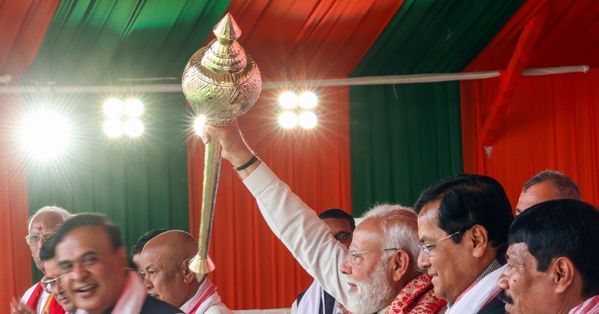 圖:2 月 14 日,阿薩姆邦古瓦哈提舉行公開集會,總理莫迪手持刀 照片:納倫德拉莫迪照片庫/ANI Photo
