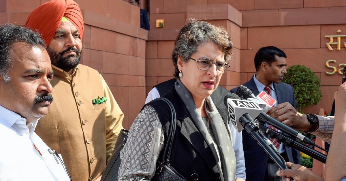 圖:2026 年 2 月 12 日新德里,國大黨議員普麗揚卡甘地在正在進行的預算會議期間在議會場地向媒體發表講話,黨內議員馬尼卡姆泰戈爾(左)在場。 照片:Jitender Gupta/ANI 照片