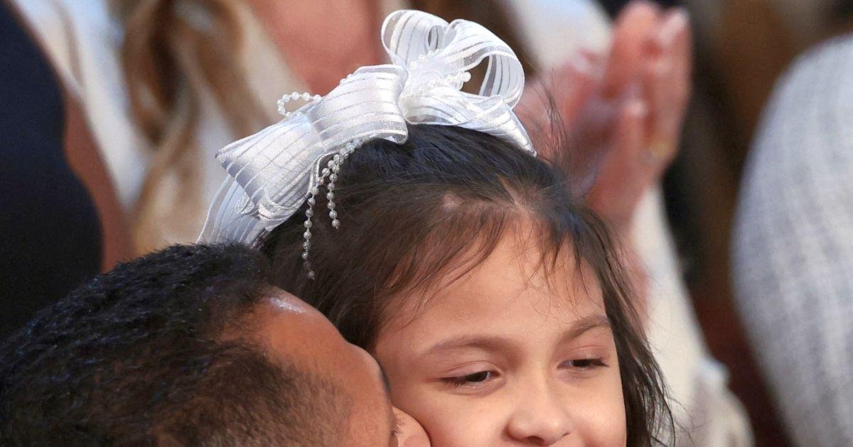 「她甚至無法再吃飯了。但儘管困難重重,她現在已經上一年級,正在學習走路,今晚和她爸爸一起……達利拉……你真是一個鼓舞人心的人。請站起來,」他說。