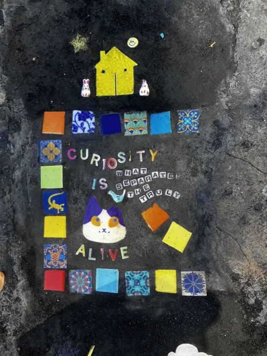 他們開始用恐龍玩具填滿人行道上的洞。然後轉向製作馬賽克瓷磚。