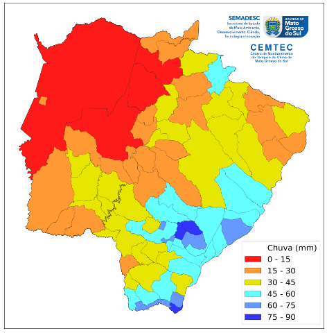在最南端、東南部和東部地區,最高積累量在45至90毫米之間,而在潘塔納爾濕地、中北部和東北部地區,積累量甚至更低,在0至45毫米之間。例如,在該州有記錄的水量最高的城市 Anaurilandia,累計水量為 106.6 毫米,該值仍比歷史月平均值 116.2 毫米低 8%。