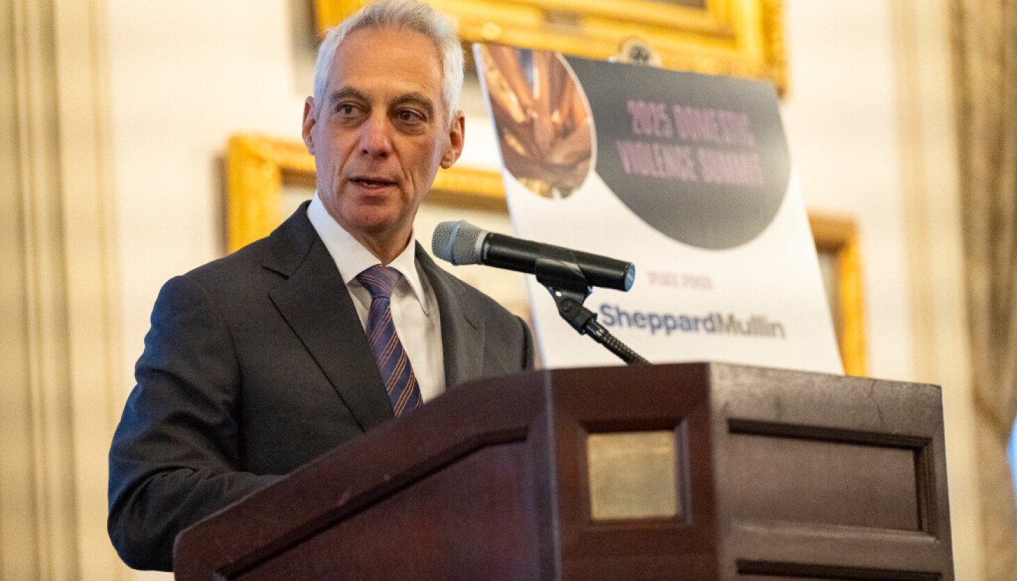 芝加哥前市長拉姆·伊曼紐爾週四在盧普區芝加哥聯合俱樂部發表講話時強調,需要更多的男性採取行動反對家庭暴力。