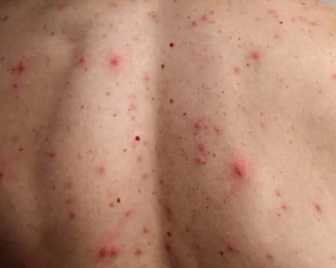 首次出現症狀後 3 至 5 天,會出現帶紅點的皮疹: