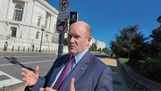 特拉華州民主黨參議員克里斯·庫恩斯走過美國國會大廈的參議院地鐵站。 2025 年 1 月在華盛頓 (安娜·錢梅梅克/蓋蒂圖片社)