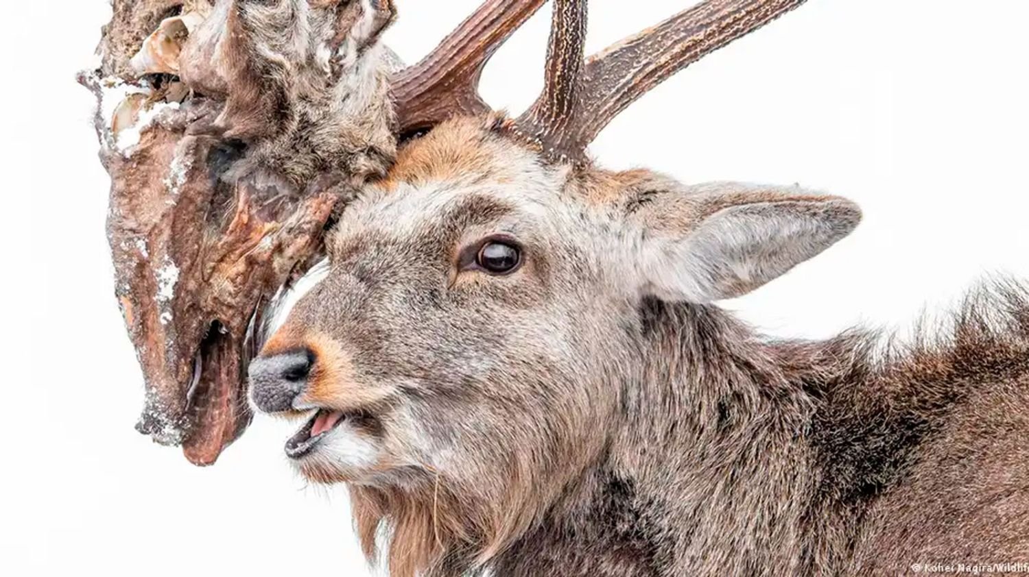 在決賽入圍者中它脫穎而出 Kohei Nagira 在日本北海道拍攝的梅花鹿照片。這張照片顯示了這只鹿在交配季節經歷了一場致命的戰鬥:它的鹿角鉤住了死去的對手的鹿角,據官方聲明援引當地漁民的說法,鹿拖著屍體好幾天,直到只剩下頭。