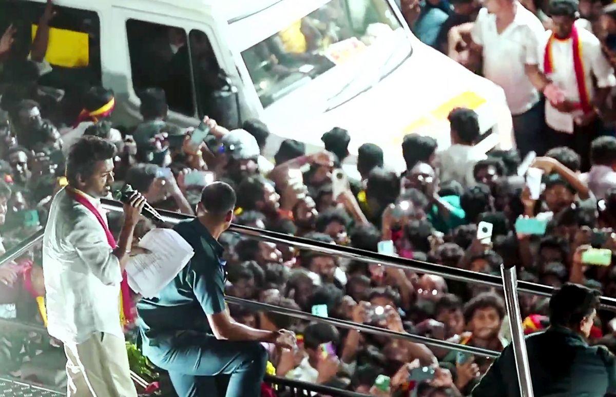 圖片:Vijay在Stampede之前針對Karur Rally。 照片:TVK/ANI視頻抓取