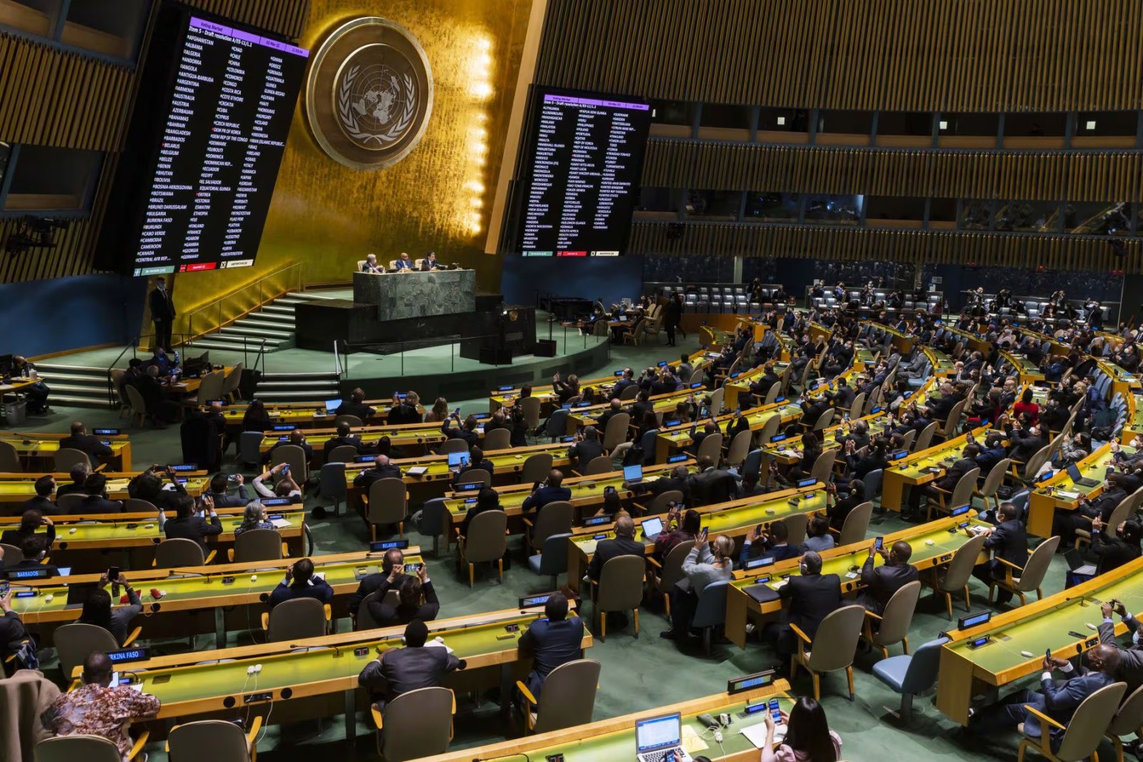 之間 拒絕該文本的是俄羅斯 和盟友,例如 伊朗、古巴和白俄羅斯除了 尼加拉瓜和幾個非洲國家儘管 中國和美國均投下棄權票。