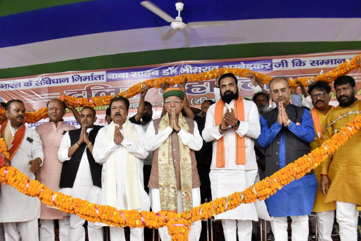 圖片:2025 年 4 月 27 日,聯邦法律和司法部長阿爾瓊·拉姆·梅格瓦爾 (Arjun Ram Meghwal) 與比哈爾邦副首席部長薩姆拉特·喬杜里 (Samrat Chaudhary) 和印度人民黨主席迪利普·賈什瓦爾 (Dilip Jaishwal) 在巴特那的達利特·馬哈潘查亞特 (Dalit Mahapanchayat)。 照片:ANI 照片