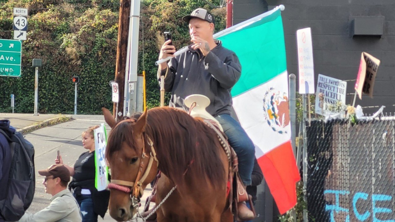 週日下午,騎兵出現了。這次馬匹抗議活動發生在一天后。 大約四萬人在波特蘭市中心遊行。 這是全國“無國王”集會的一部分。