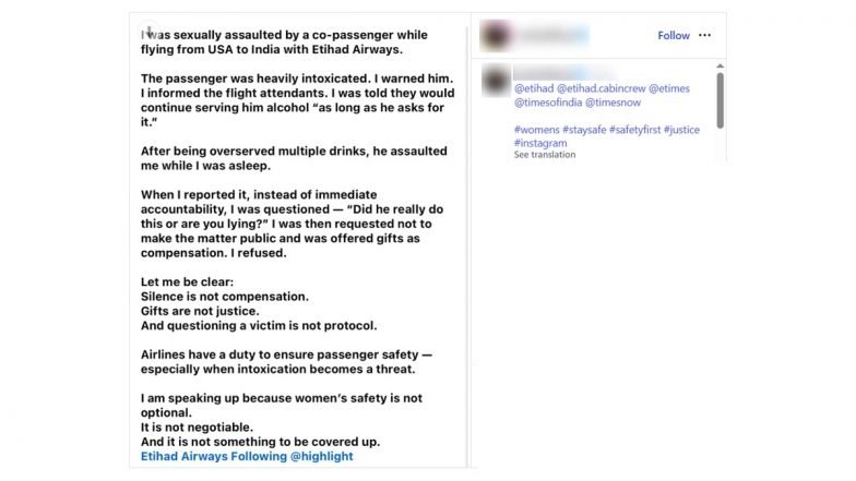 2025 年印度環境小姐最近在 Instagram 上聲稱,她在從美國飛往印度的航班上遭到一名同行乘客的性騷擾。這位前印度小姐參賽者補充說,這名乘客喝得酩酊大醉。據稱事件發生在阿提哈德航空從美國飛往印度的航班上。 「當我提出這個問題時,他們並沒有立即追究我的責任,而是問我——『她真的這麼做了還是你在撒謊,』」這位女士在帖子中說道。她還聲稱,她被告知,只要乘客提出要求,機組人員就會繼續向他提供酒精。 2025年環境小姐也表示,她被告知不要接受這份禮物。她補充說:“航空公司有責任確保乘客的安全。”阿提哈德航空在回應她的帖子時表示:“這似乎不對,我們肯定想調查發生了什麼。請查看,以便我們為您提供進一步幫助。”