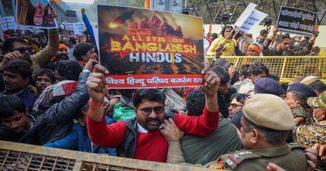 圖片:2025 年 12 月 23 日,在新德里孟加拉國高級專員公署附近,孟加拉國不同印度教團體的活動人士在抗議一名印度教男子被私刑時與警方發生衝突。 照片:阿德南·阿比迪/路透社