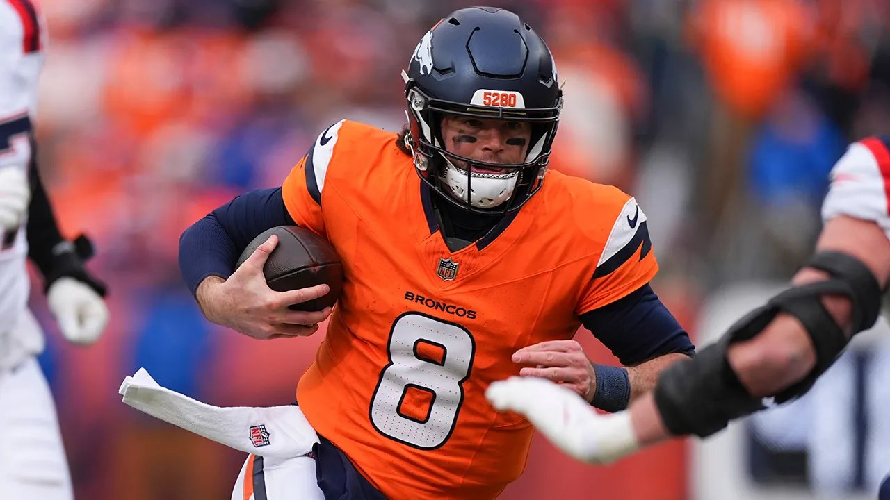 丹佛野馬隊四分衛賈勒特·斯蒂德姆 (Jarrett Stidham)(8 歲)於 2026 年 1 月 25 日星期日在丹佛舉行的亞足聯冠軍 NFL 橄欖球賽上半場與新英格蘭愛國者隊爭奪。 (美聯社照片/大衛·扎魯博夫斯基)