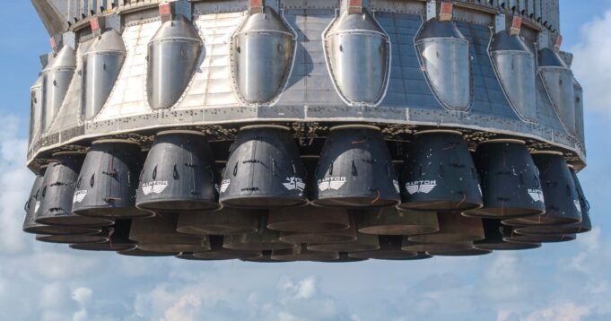 其中一張圖片顯示了超重型助推器底部的 33 個猛禽發動機附近的情況,而另一張圖片則顯示了發射塔上用於將放大器固定到位的巨型機械臂。這些都是所謂的“筷子”,在之前的幾次飛行測試中確保了放大器的安全,儘管即將發貨的超重型飛機將在水面上進行受控著陸,而不是返回基地。