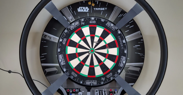 Target Darts Omni 自動計分系統與 DartCounter 應用程序(Android 或 iOS)配對。它組裝起來既快速又簡單,通過磁性腳連接到您的主板上,但您需要將電源線插入插座。連接到 Wi-Fi,進行快速校準,然後就可以開始玩了。我用 Target 的星球大戰千年隼環繞和飛鏢盤(200 美元或 150 英鎊)和一套達斯維達飛鏢(340 美元或 250 英鎊)進行了測試,這都是送給您生活中的星球大戰粉絲的絕佳禮物,但它應該適用於大多數飛鏢和所有飛鏢。