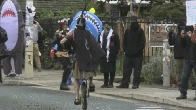 這是南波特蘭 Macadam 的 Ice 裝置中的一個活躍場景,但抗議是和平的。