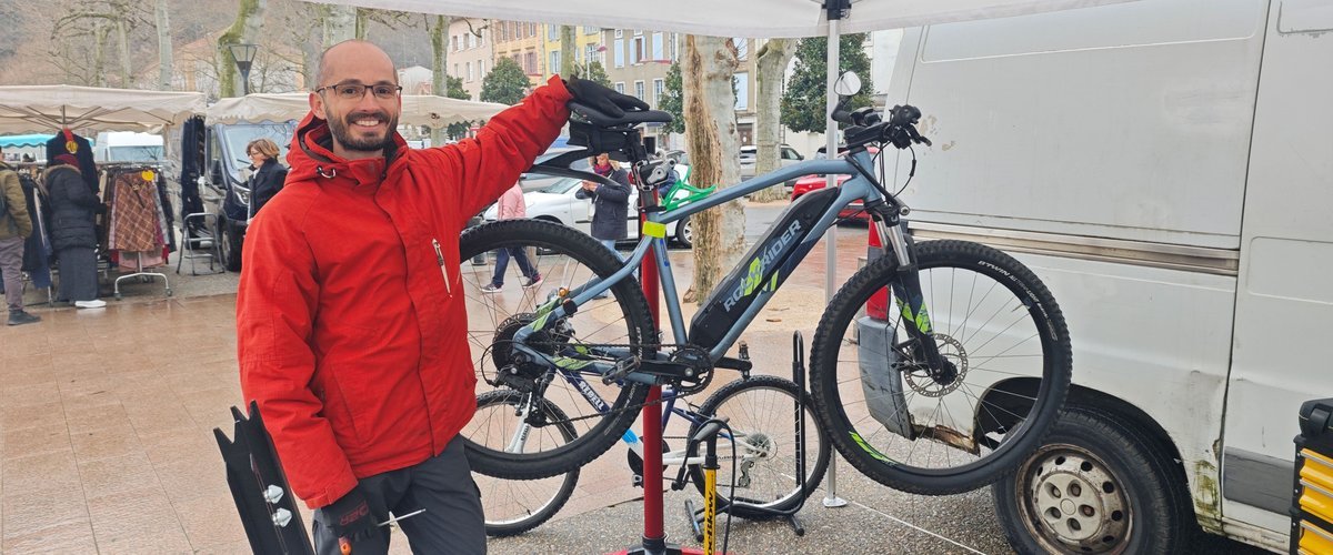 在寒冷的環境中,雨水引導著行人的腳步,每週五的市集都讓富瓦充滿生氣。在幾個攤位中,有一個特別的作坊吸引了人們的注意。紀堯姆·布里埃爾(Guillaume Brière)在他的白色卡車前當著所有人的面修理自行車。在 Foix 進入市場之前,兩輪車修理工經歷過許多其他職業。