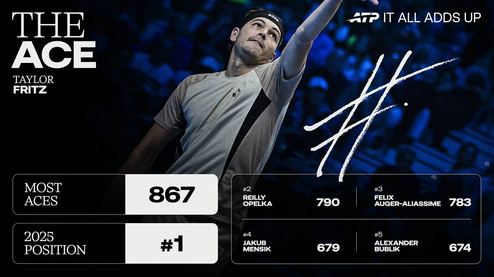 泰勒·弗里茨 (Taylor Fritz) 鞏固了自己作為比賽中最具統治力的發球手之一的地位,她在 2025 年打出了巡迴賽領先的 867 個 Ace。 巡迴賽的其餘部分值得關注,因為 Infosys ATP 數據顯示弗里茨正處於明顯的上升軌道。