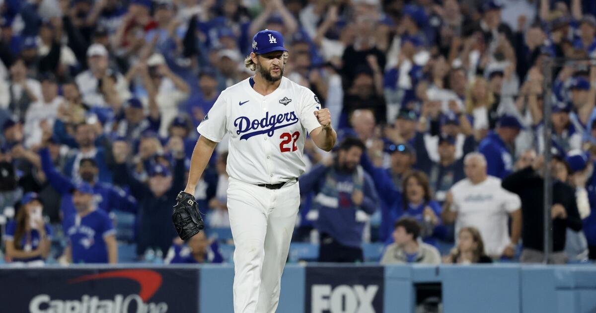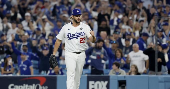 克萊頓·克肖 (Clayton Kershaw) 週一在道奇體育場 (Dodger Stadium) 舉行的世界大賽第 3 場對陣多倫多藍鳥隊 (Toronto Blue Jays) 的比賽中,在第 12 局投球。