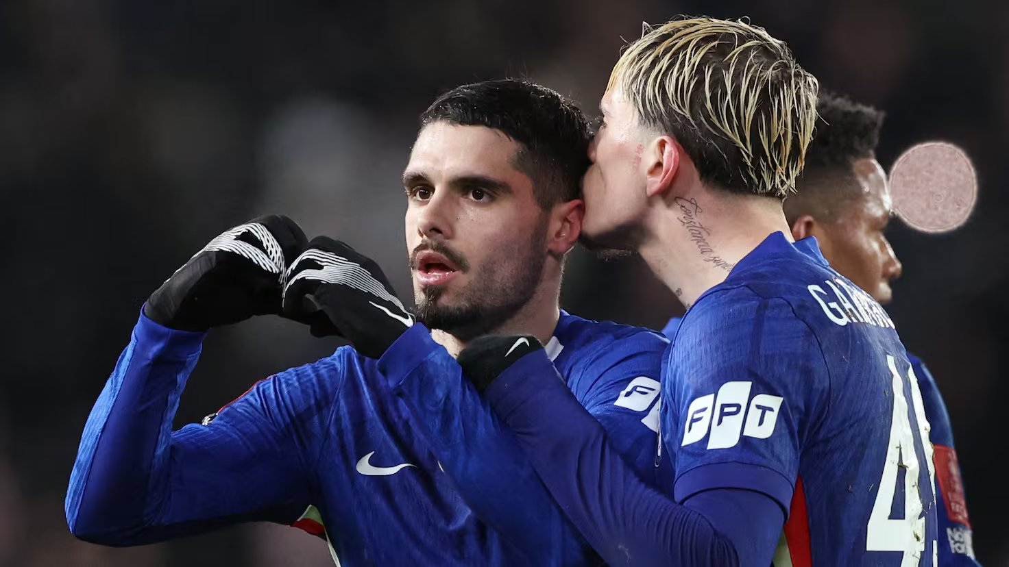 切爾西球員佩德羅·內托和利亞姆·德拉普慶祝葡萄牙人在足總杯對陣赫爾城的比賽中進球。李史密斯