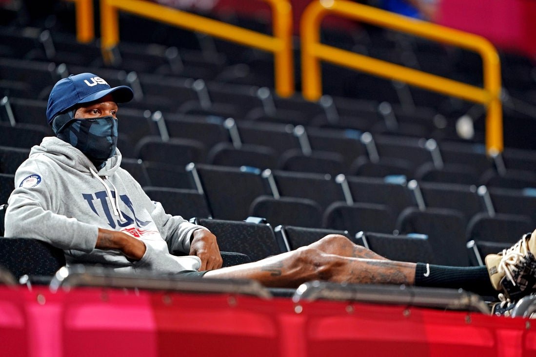 2021 年 8 月 6 日;日本埼玉;美國男籃凱文·杜蘭特在埼玉超級競技場觀看 2020 年東京夏季奧運會美國隊與塞爾維亞隊的女籃半決賽。強制信用:Karim Elgazar-Imagon Image