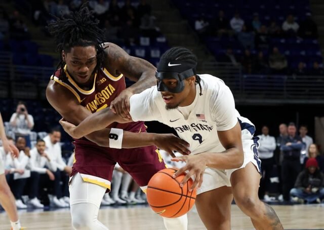 週日下午在賓夕法尼亞州立大學舉行的十大聯盟對決中,凱登·明戈在比賽還剩 1.4 秒時上籃得分,幫助賓夕法尼亞州立大學以 77-75 戰勝明尼蘇達大學。